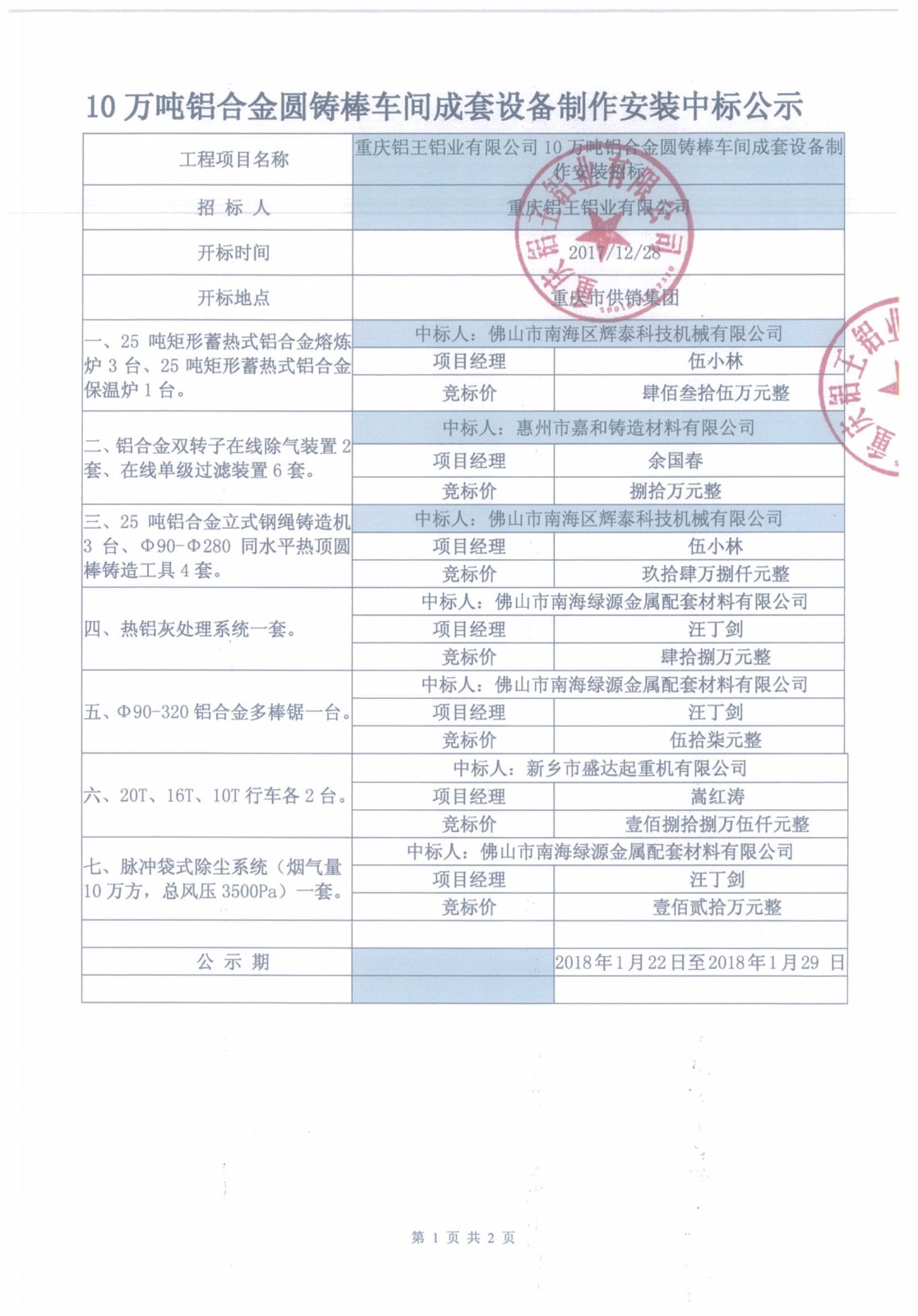 重庆铝王铝业有限公司10万吨铝合金圆铸棒车间成套设备中标公示(1)
